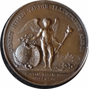 This medallion was struck to celebrate the dynastic marriage of the Prince of Wales and Caroline of Brunswick. The reverse imagery of Hymen, god of marriage, uniting the couple’s arms under blazing torches, symbolises harmony and dynastic union. In reality, the marriage was deeply troubled, with the couple separating soon after the birth of their daughter, Princess Charlotte. The medal thus reflects the idealised hopes of the time, standing today as both a commemorative and a poignant reminder of George IV’s turbulent personal life.