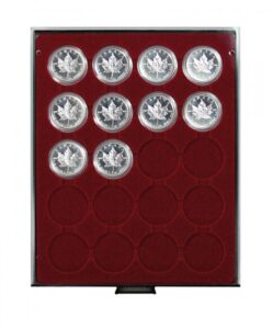 COIN BOX STANDARD WITH 30 ROUND COMPARTMENTS FOR COIN CAPSULES WITH AN EXTERNAL Ø OF 39.5 MM.E.G. FOR 10 OR 20 EURO SILVER COINS GERMANY IN LINDNER COIN CAPSULES.