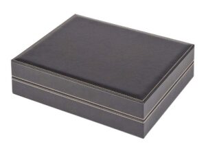 Coin case with black, grained surface in leather optic and crème colored stitching. Graphite colored and padded lining of the lid. With 3 trays and dark red coin inserts with 20 rectangular compartments. The coin inserts are covered with a high quality velour-like surface. Format: 310 mm x 255 mm x 82 mm. Suitable for coin holders 50×50 mm, coin capsules CARRÉE or OCTO coin capsules. e.g. suitable for: For coin holders 50 x 50 mm, coin capsules CARRÉE, coin capsules