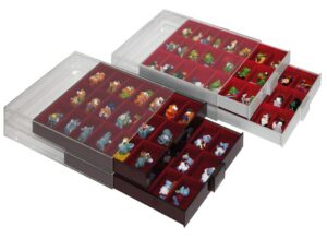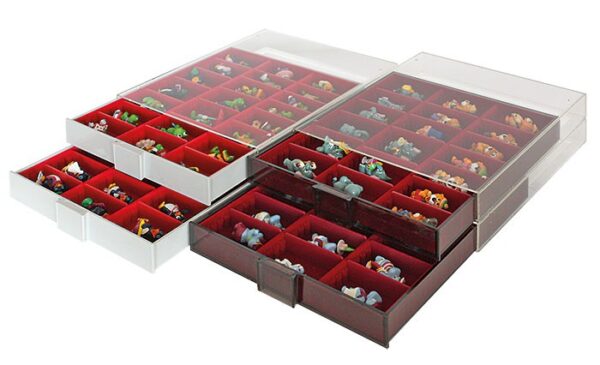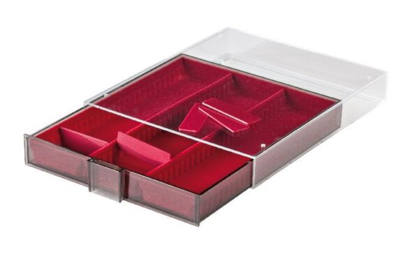 LINDNER collection box with 3 compartments and 8 movable dividers for individual configuration. LINDNER collection boxes, coin boxes and d-boxes can be mixed and easily stacked on top of each other. Only the height of each box is different. Suitable for collectibles with a max. height of 29 mm the collection boxes offer plenty of room for your special treasures or medals, minerals, decorations, medals, watches, jewellery, tin soldiers, pill boxes, valuable buttons and lighters, silver and gold items, precious vacation souvenirs and much, much more. The collection boxes come in different lay-outs including movable dividers to customize the individual compartments. MADE IN GERMANY. Most LINDNER collection boxes are available in 2 different designs: STANDARD, with a light grey drawer, a clear frame and a light red insert or SMOKED GLASS, with a drawer in smoked glass optic, a clear frame and a dark red insert.