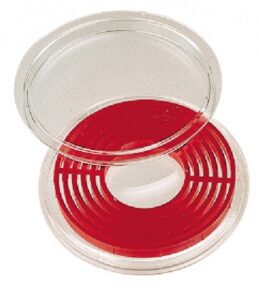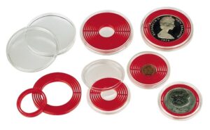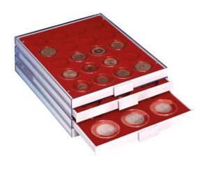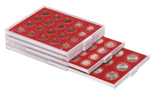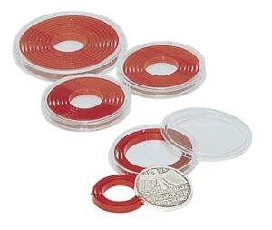 LINDNER COIN BOX CAPSULE. SMALL. 16 – 39 MM Ø WITH LIGHT RED INLETT – PACK OF 10